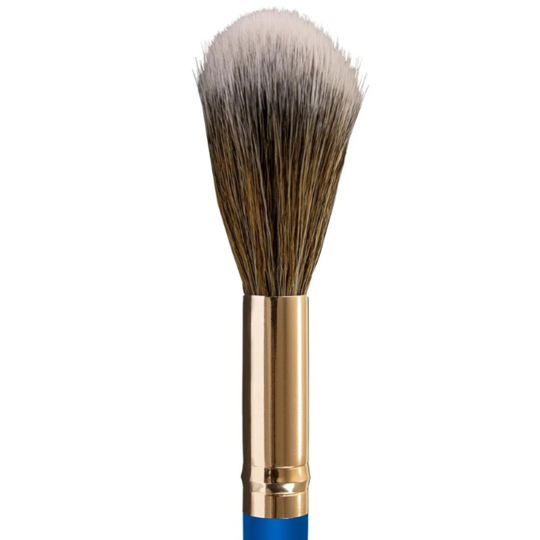 Cerdas sintéticas, cabo em madeira e ponteira em cobre dourado.